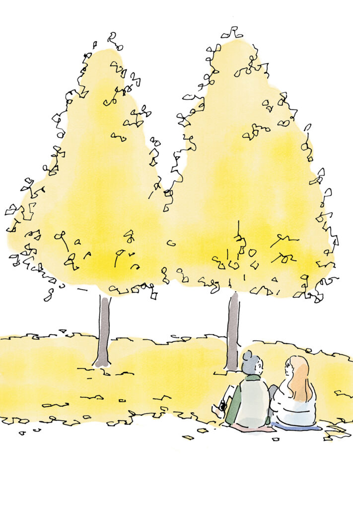 ・近所には公園がいくつかある。そのうちの最も近いものは、古い遊具がおざなりに点在しているだけで正直に言っていまいち冴えない公園だ。その公園の最も美しい季節は秋だと思う。カエデや桜やイチョウが一斉に色づいて日々色を変えていく。普段は人もまばらな公園だが、足を止めて写真を撮る人もよく見かける。先日は二本のイチョウのように、女の子二人が並んで落ち葉の絨毯に座り、イチョウを眺めていた。