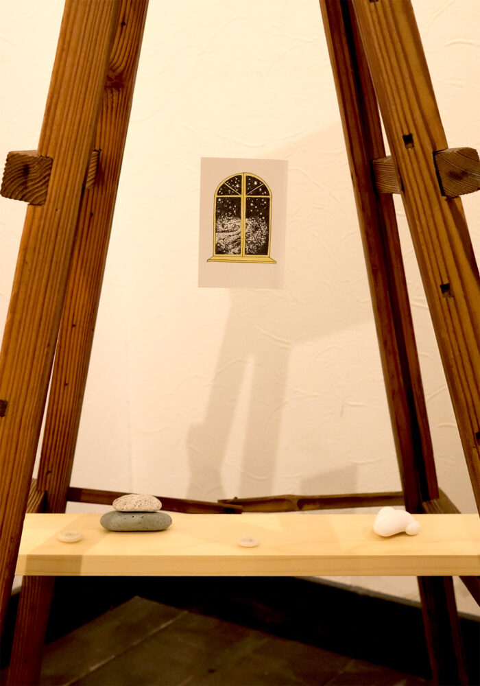 ・今回の恵文社の展示では画集に収録されているイラストのパネル展示に加えて、古道具の什器に蚤の市で見つけた玩具や、小石や貝殻を一緒に展示してみた。絵を飾るだけではなく、絵と共に場を立ち上げていく試みをもっと考えてみたい。