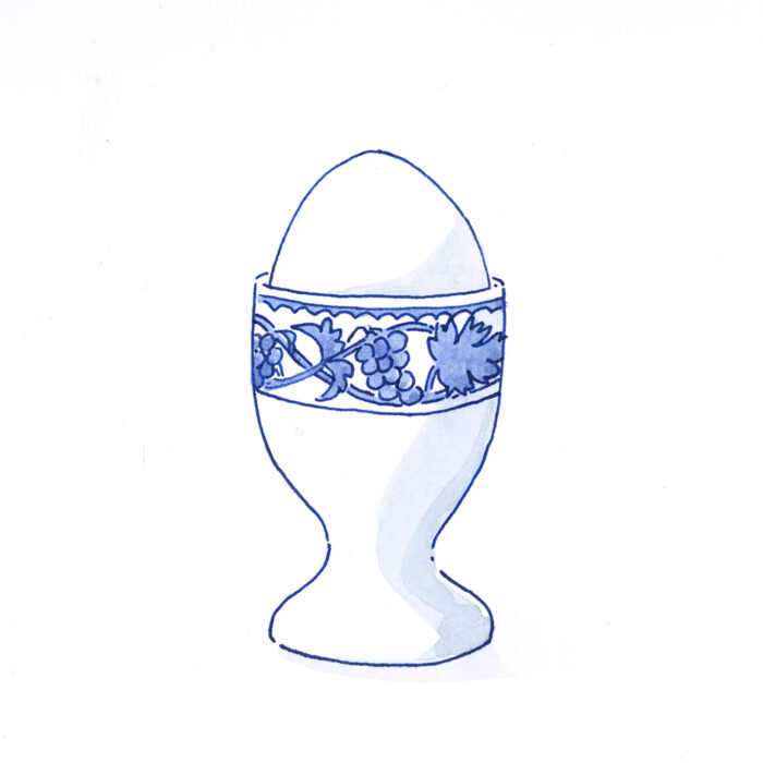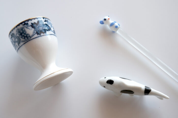 ・ニッコーのブドウ柄シリーズのエッグスタンド、牛柄のコイの箸置き、ガラスのパンダのマドラーを買った。エッグスタンドは、卵を立てるというあまりにも用途が限定された器なのが好きだ。子どもの頃に読んだ児童書にエッグスタンドが出てくると、そんな知らない生活の一端を感じてどきどきしたのを思い出す。素焼きの義卵を立てた。